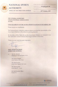 In the letter released and signed by the Director General of the NSA, Professor Peter Twumasi, the venue will be used for a host of festivities that will happen in December hence clubs should resort to the use of their alternative venues for their home games.