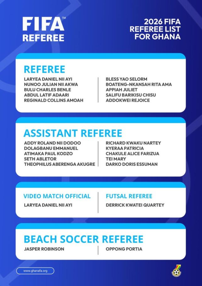FIFA has officially unveiled the list of Ghanaian referees approved to officiate international matches for the 2026 calendar year, reaffirming Ghana’s strong representation on the global officiating stage.