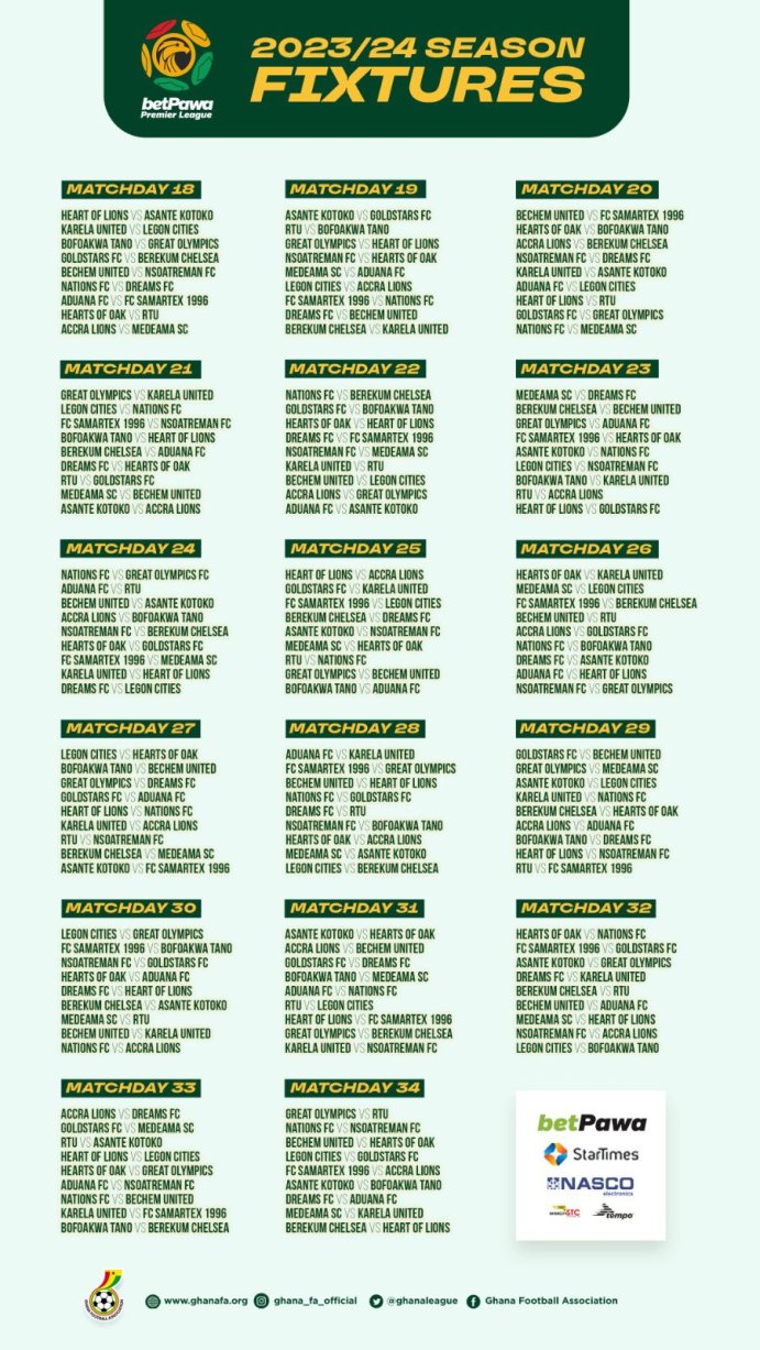 The season promises to be exciting with lots of mouthwatering clashes lined up in the subsequent matchdays with rivals Asante Kotoko SC and Hearts of Oak SC set to face each other on Matchday 14 and 31 at the Accra Sports Stadium and the Baba Yara Stadium respectively.