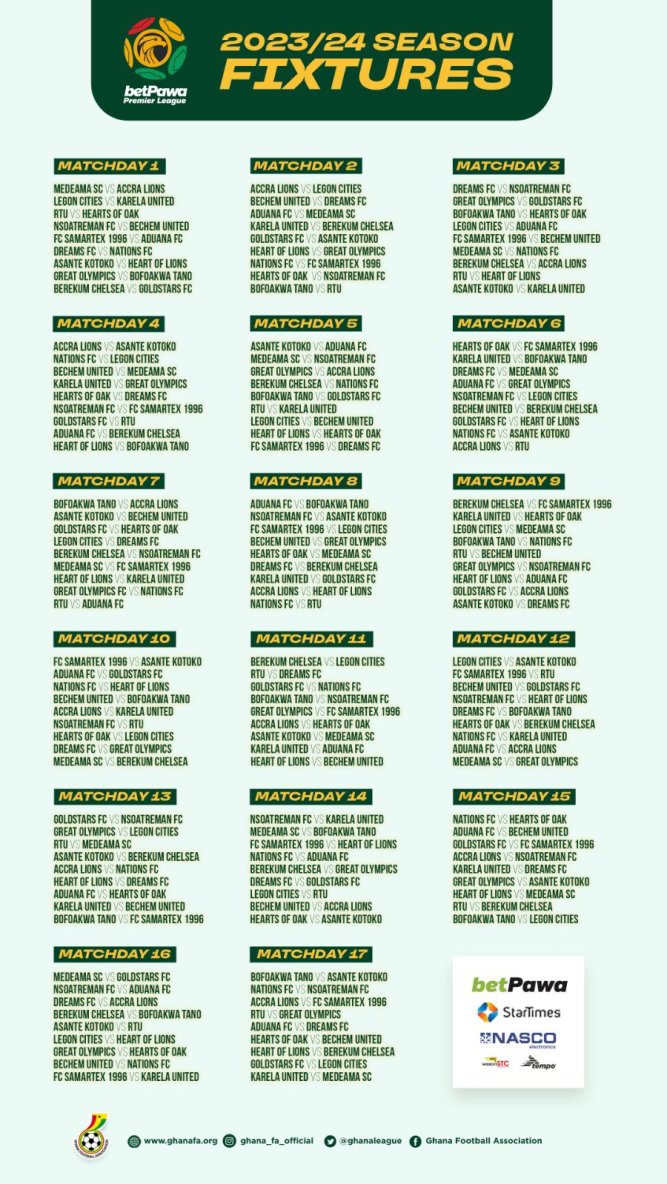 The 2023/24 betPawa Premier League fixtures have been released and the schedule for all 306 matches have been confirmed.